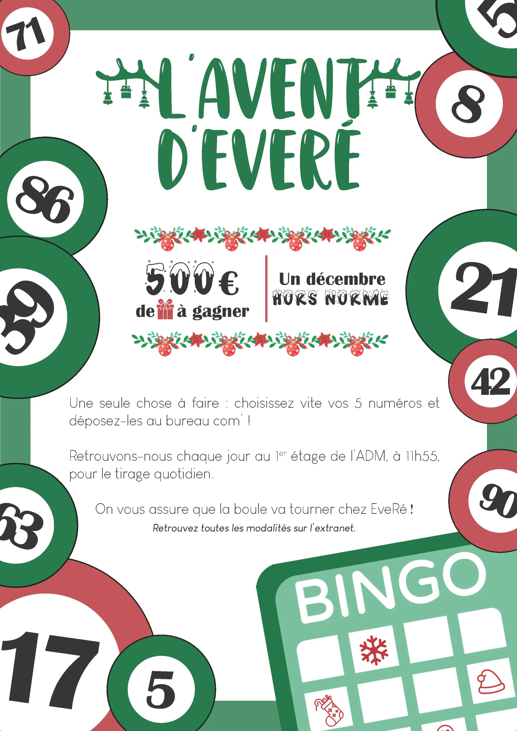 Pour tenter votre chance, choisissez vos 5 numéros porte-bonheur (et pas plus les p’tits lutins !). Un formulaire est disponible sur le comptoir d’accueil de l’ADM. Du 1er au 22 décembre*, 5 boules seront tirées au sort par un·e ou des volontaires à 11h55 au 1er étage de l’ADM.