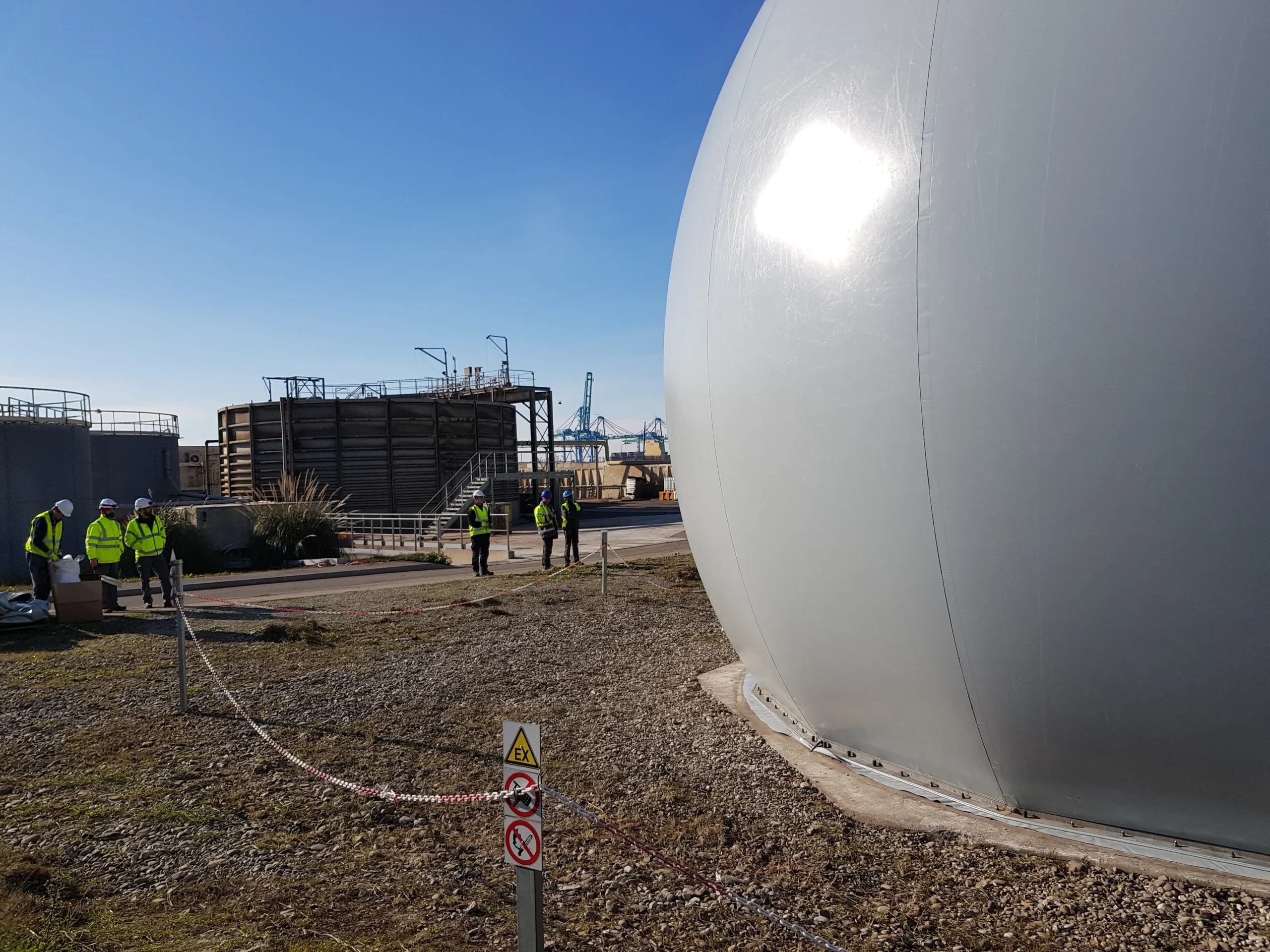 Après les analyseurs de l’UVE, c’est au tour de la bâche souple d’être remplacée. D’une capacité de 1 040 m3, elle agit comme une réserve de biogaz et est composée d’une double enveloppe. Une enveloppe extérieure gonflée à l’air et une enveloppe intérieure gonflée au biogaz.